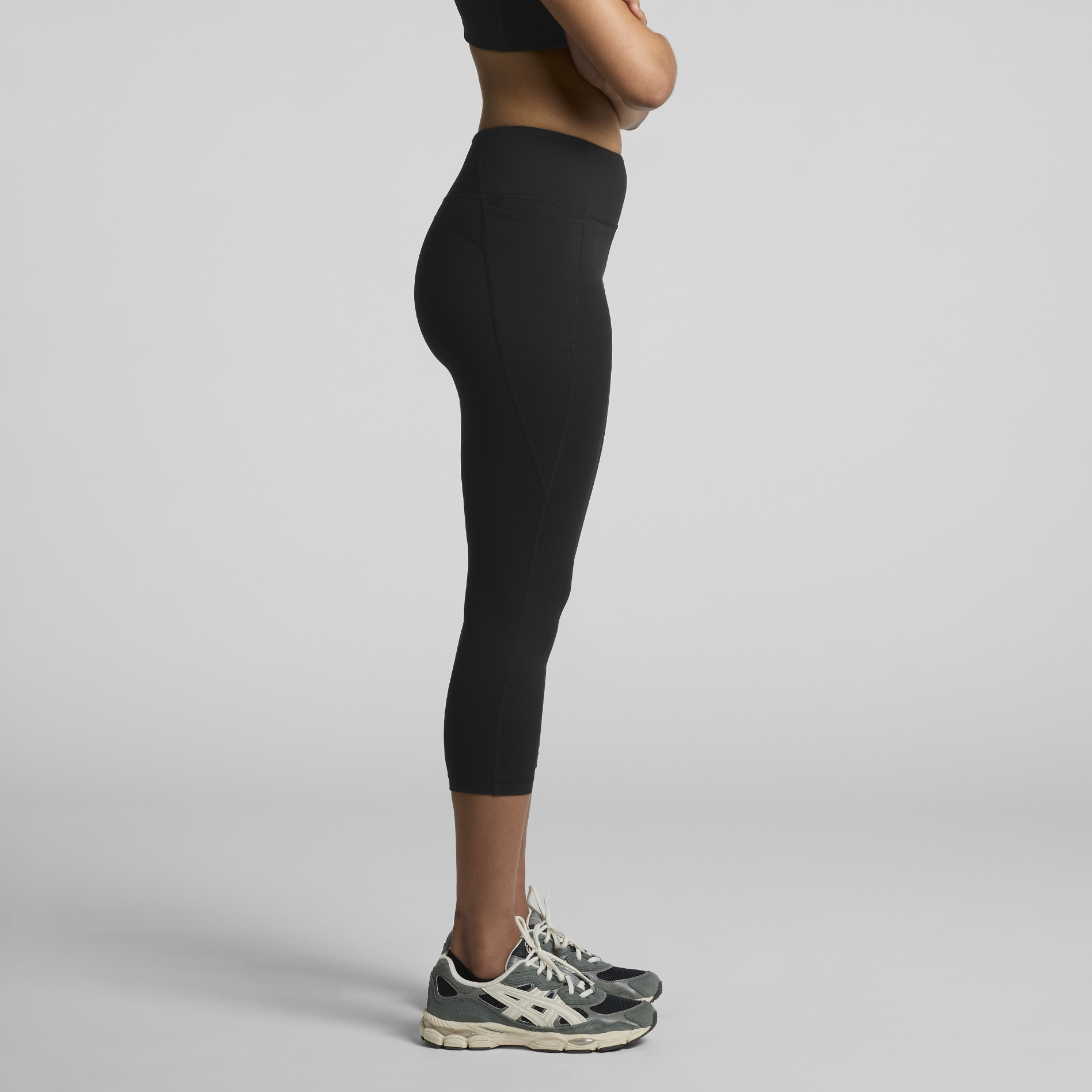 Matte finish, mid calf length, high waist, 2 x side pockets, contour seam detailing, moisture wicking, quick drying, high elastane content for resilience, suitable for low to medium impact activities